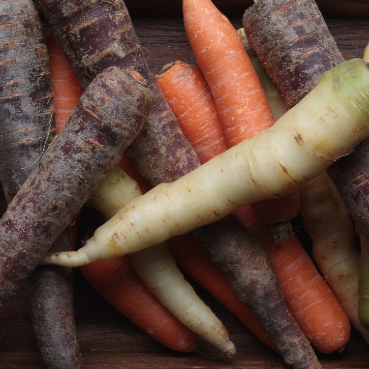 Rainbow mixed carrots are a visually striking assortment of carrots in various vibrant colors, including deep purple, bright orange, pale yellow, and occasionally white or red. Each carrot is long, thick, and tapered, with a smooth outer surface. The colors range from solid to subtly streaked or marbled, depending on the variety. When cut, the inner flesh often reveals contrasting hues—like purple with a yellow core or orange with a white center. These carrots have a firm, crunchy texture and offer a range of flavors, from mildly sweet and earthy in the yellow and orange varieties to slightly peppery or herbal in the purple ones. Their bold appearance and diverse taste make them perfect for colorful salads, roasted vegetable dishes, or raw snacks.