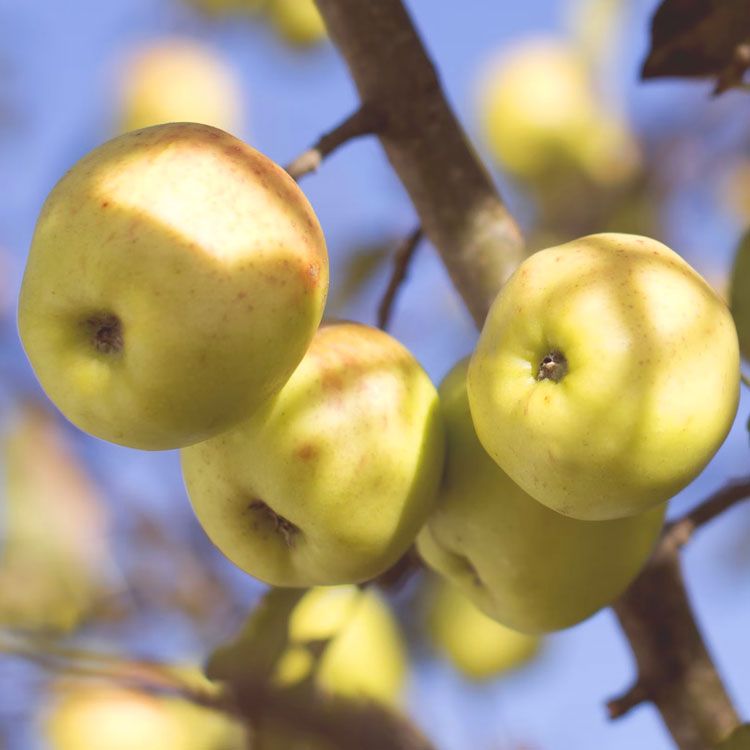 Golden-yellow in color with firm white flesh, balanced sweetness and acidity. This multipurpose work horse can handle many preparations. Good for eating out of hand and in salads as well as being cooked and used in tarts and pies.