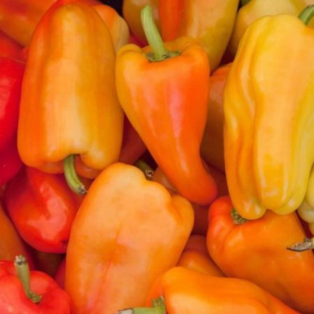 Gypsy Peppers are medium size with a long, tapered shape. The color changes from yellow-green to orange and then red as they ripen during the harvest. They have intense sweet flavor and are excellent for roasting and stuffing.