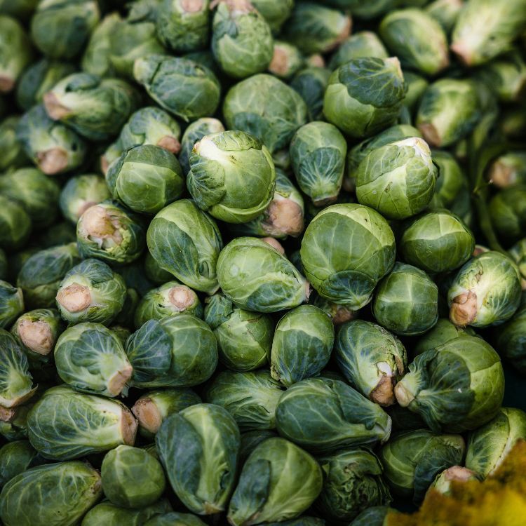 Brussels sprouts are small, round vegetables that look like miniature cabbages. They grow in clusters along a thick stalk and are typically about 1 to 2 inches in diameter. Brussels sprouts have tightly packed, green leaves and a slightly nutty, earthy flavor, with a hint of bitterness. When cooked, they become tender and can develop a sweet, caramelized taste, especially when roasted or sautéed.