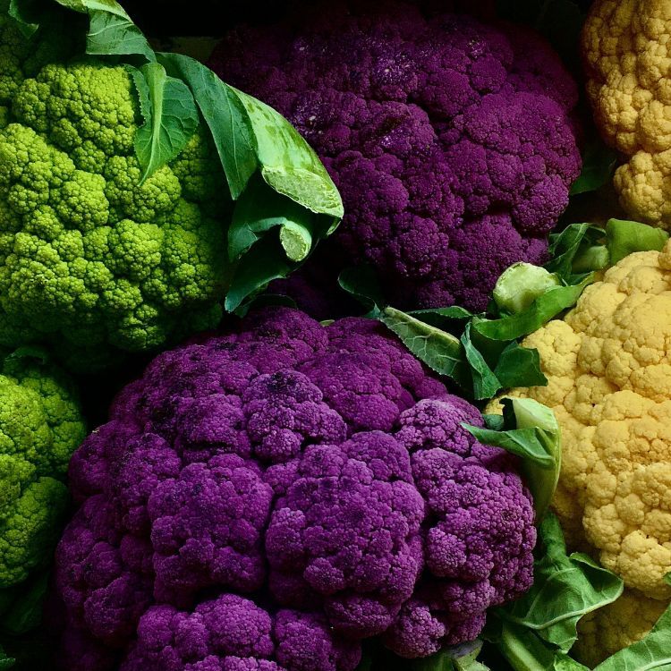 Purple Cauliflower: Features a striking purple color due to anthocyanins, the same pigments found in red cabbage and berries. It has a mild, slightly sweet flavor and retains its color when cooked, although it may turn a bit more muted.