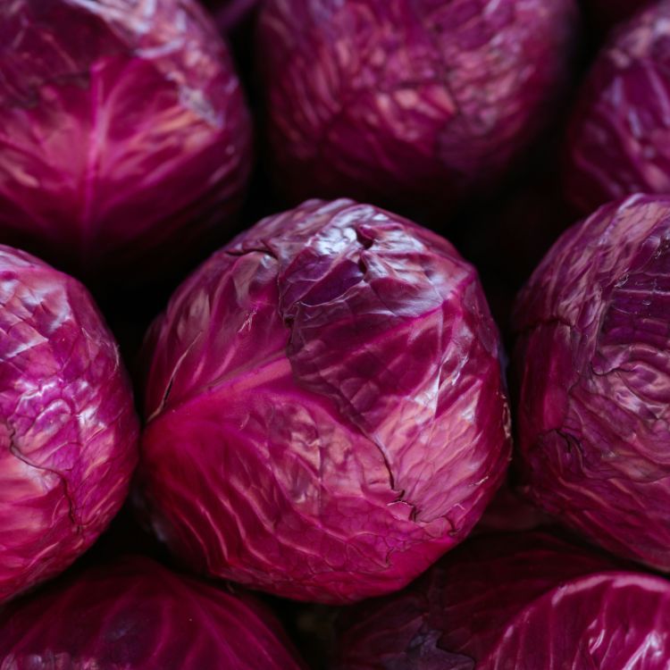 Red cabbage is a vibrant, cruciferous vegetable known for its deep purple-red leaves and round, dense head. It has a similar texture to green cabbage, with crisp, crunchy leaves that become tender when cooked. The flavor of red cabbage is slightly more peppery and robust compared to green cabbage, with a subtle sweetness. When cooked, it can develop a slightly sweeter and milder taste, especially if braised or sautéed. Red cabbage is often used in salads, slaws, and pickled dishes, and it also adds a colorful and nutritious element to soups, stews, and stir-fries.